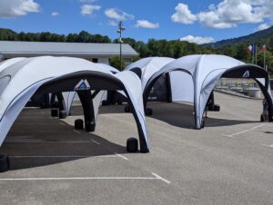 Installation d’une tente gonflable 6×6. Impression de bandeaux personnalisés à l’image de notre client : MMF Sécurité…